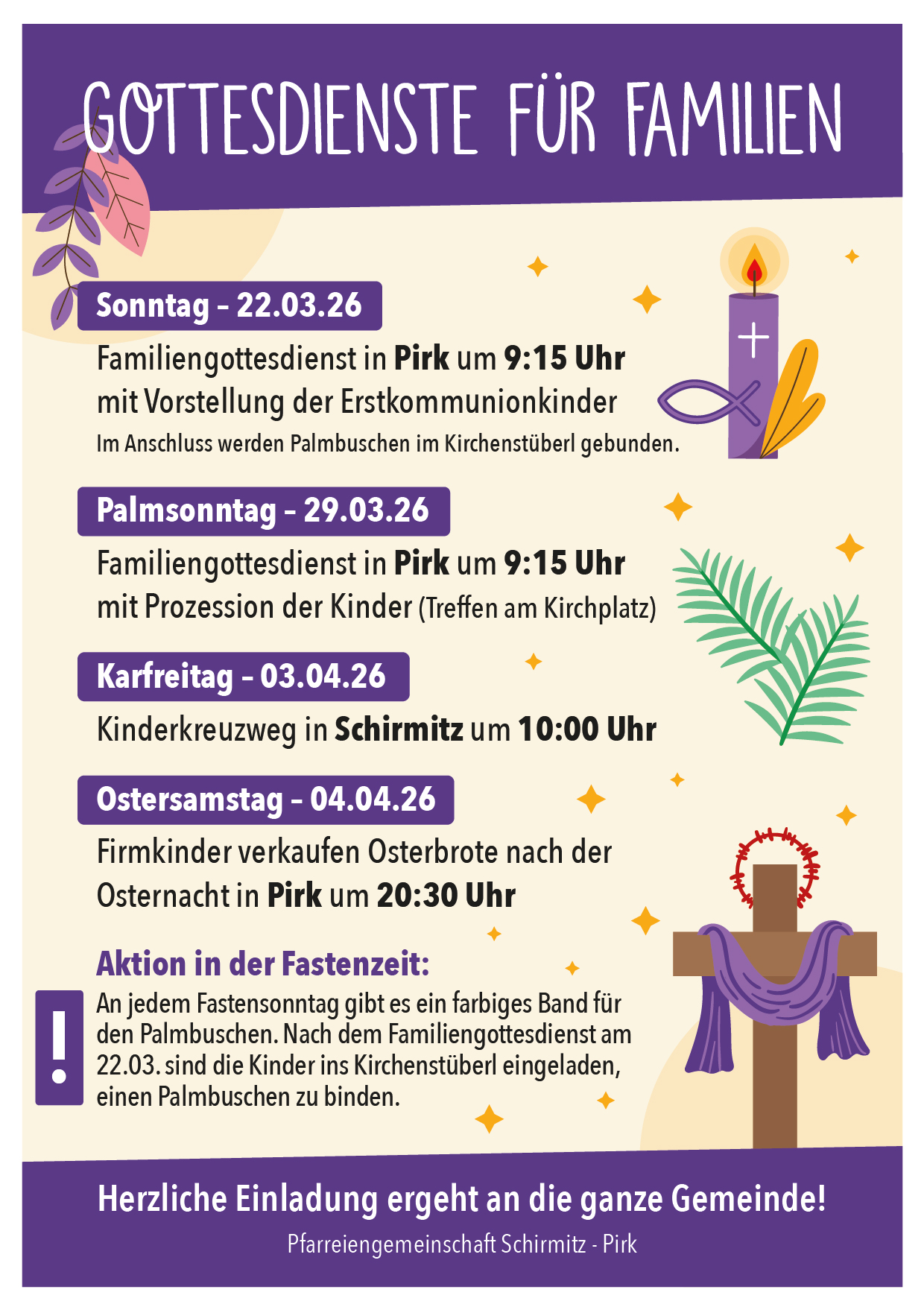 Gottesdienste für Familien Christa Bayerl, Familiengottesdienstteam2026-02-24T08:34:59+01:0024.02.26| Zeige grösseres Bild Ähnliche Beiträge Aschermittwochsschülerandacht mit Aschenauflegung am 18. Februar 2026 24.02.26 | 0 Kommentare Andacht „Boot des Lebens“ am Palmsonntag, 29. März 2026 24.02.26 | 0 Kommentare Jubiläumsfeier der Gemeinde- und Pfarrbücherei am 22. März 2026 12.02.26 | 0 Kommentare Pfarrgemeinderatswahl – Kandidat*innenliste 2026 07.02.26 | 0 Kommentare