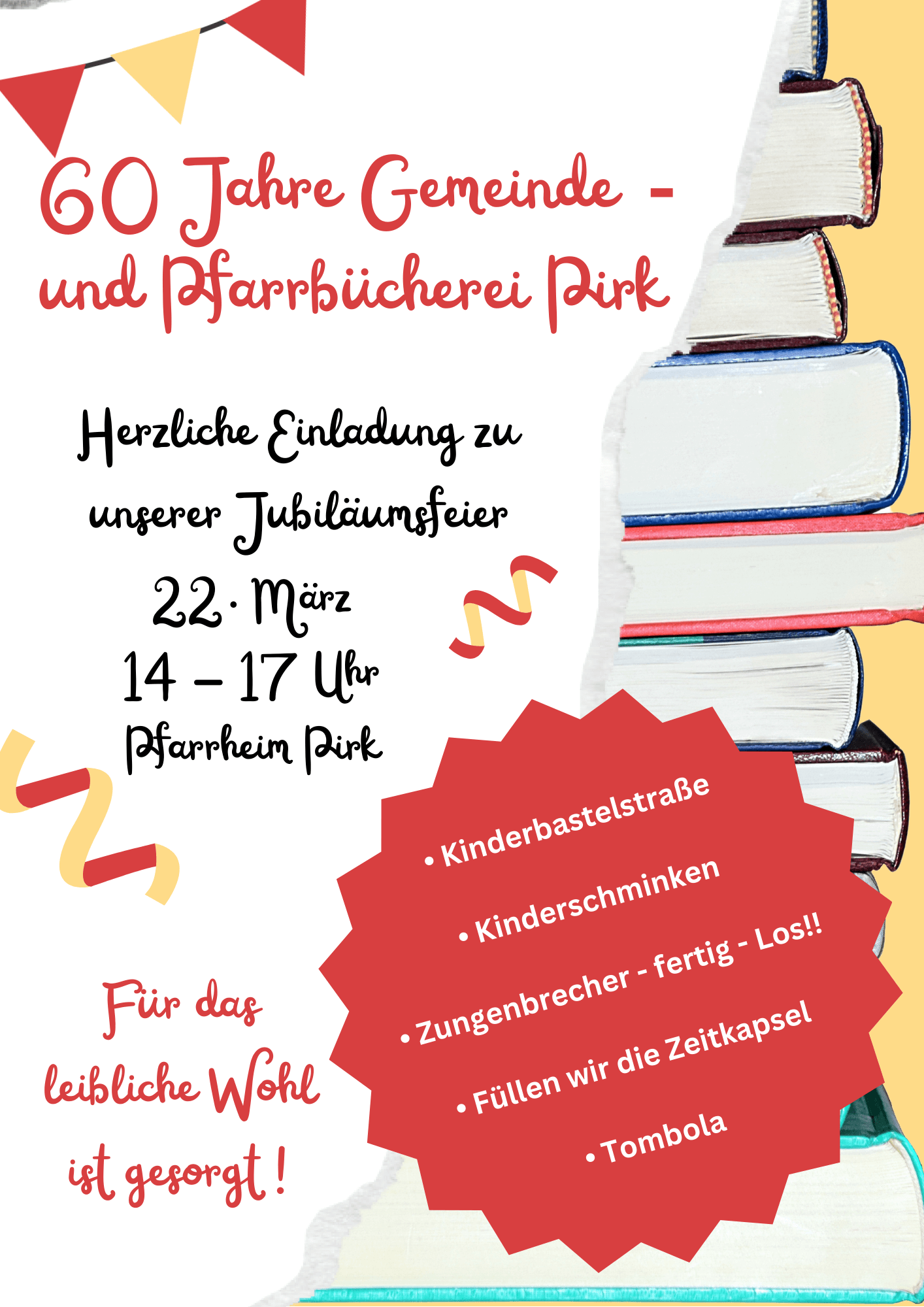 Jubiläumsfeier der Gemeinde- und Pfarrbücherei am 22. März 2026 Judith Lang2026-02-12T15:00:31+01:0012.02.26| Zeige grösseres Bild Ähnliche Beiträge 60-jähriges Jubiläum des Katholischen Frauenbundes Pirk am 08. Februar 2026 12.02.26 | 0 Kommentare Pfarrgemeinderatswahl – Kandidat*innenliste 2026 07.02.26 | 0 Kommentare Lichtmessgottesdienst am 01. Februar 2026 02.02.26 | 0 Kommentare Vorentscheid zum Wolfgangscup der Ministranten am 24. Januar 2026 02.02.26 | 0 Kommentare